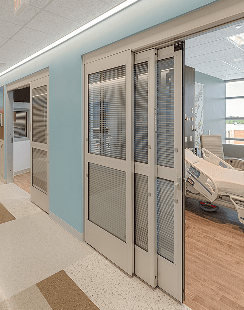 For this project, the majority of Vision Control® and Vision Control® Mini units were installed with standard glazing. They were seamlessly integrated into observation nursery rooms, patient rooms, nurse stations, alcoves, and various swing and sliding doors throughout the new hospital.